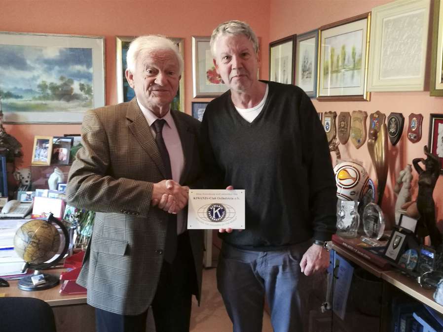 Bernd Ziemens vom Kiwanis Club Ostholstein überreichte persönlich Jovan Divjak die Spende für die Sportgeräteausstattung der Primary School in Bosnien, die Freude war riesig.